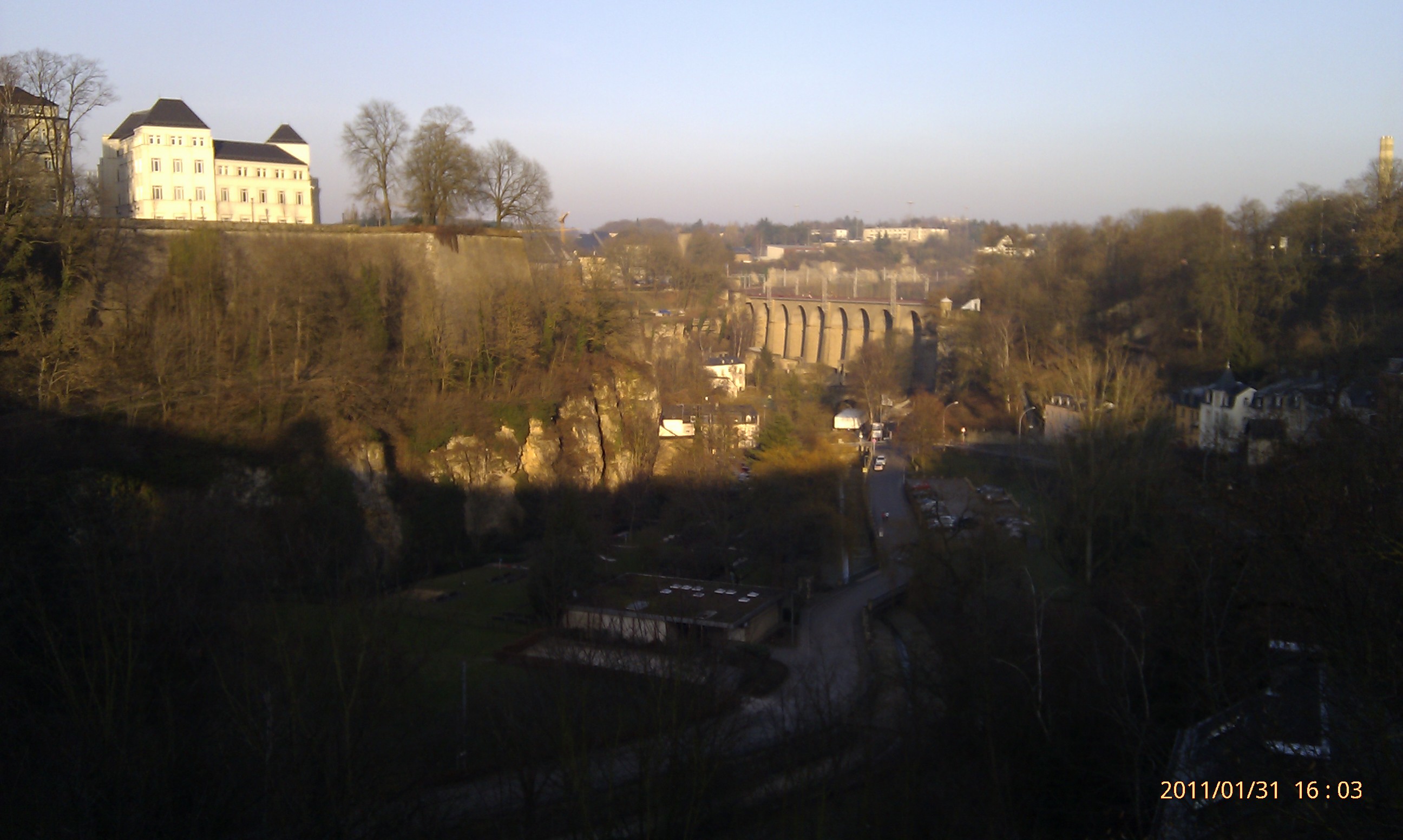 Blick vom Viadukt ins Petruss-Tal. Im Hintergrund ein Eisenbahnviadukt.