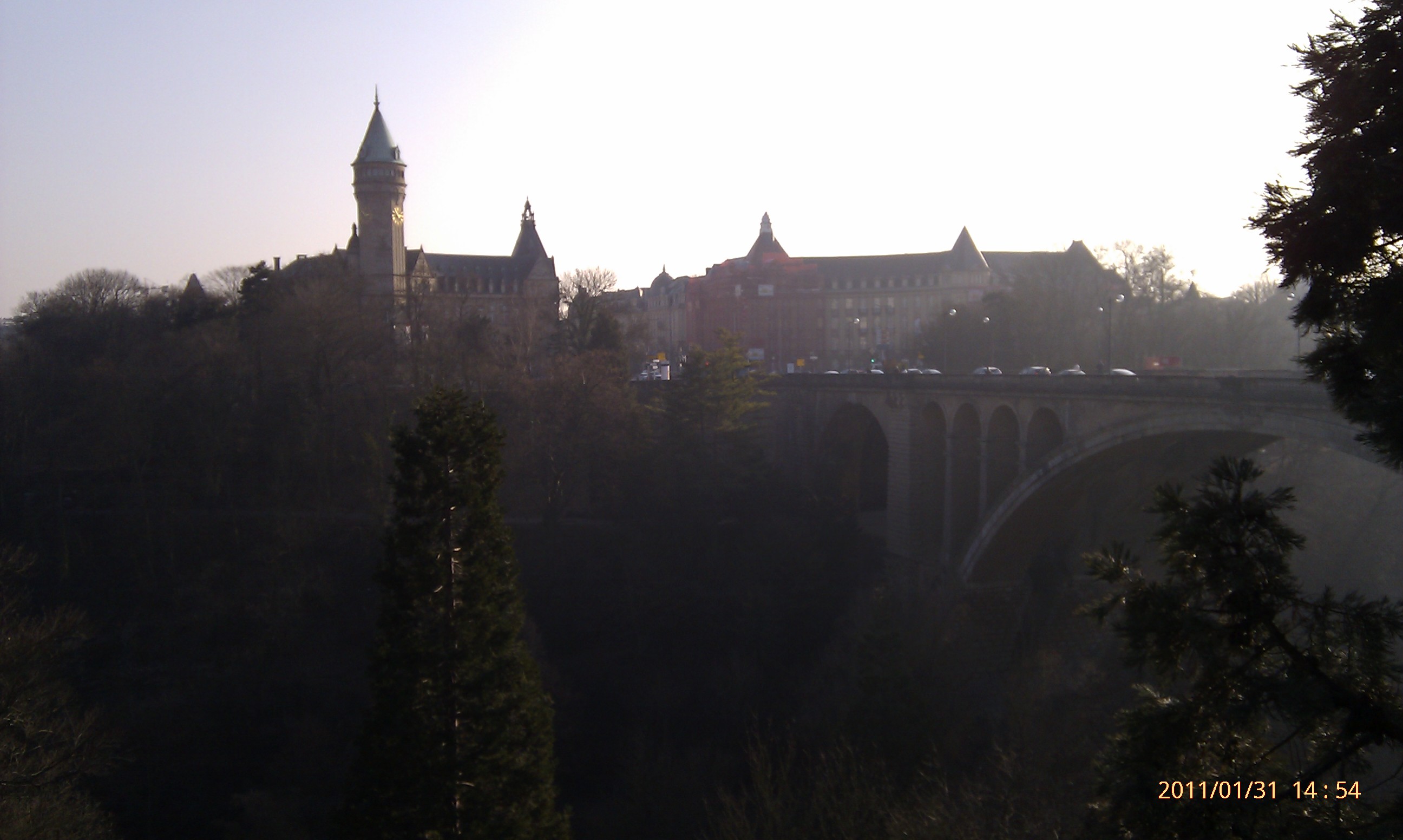 Die Gebäude der Sparkasse auf der einen Seite der Adolfsbrücke