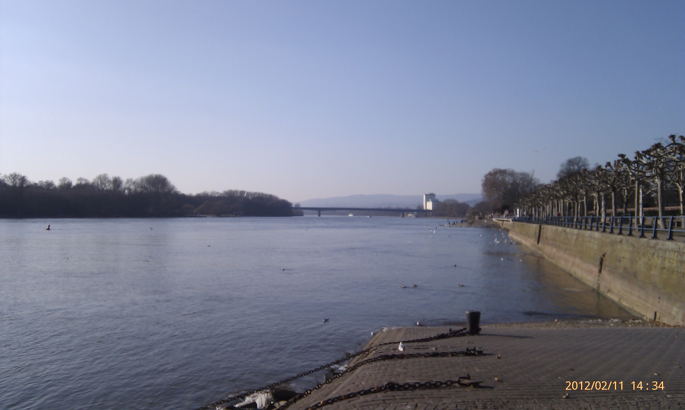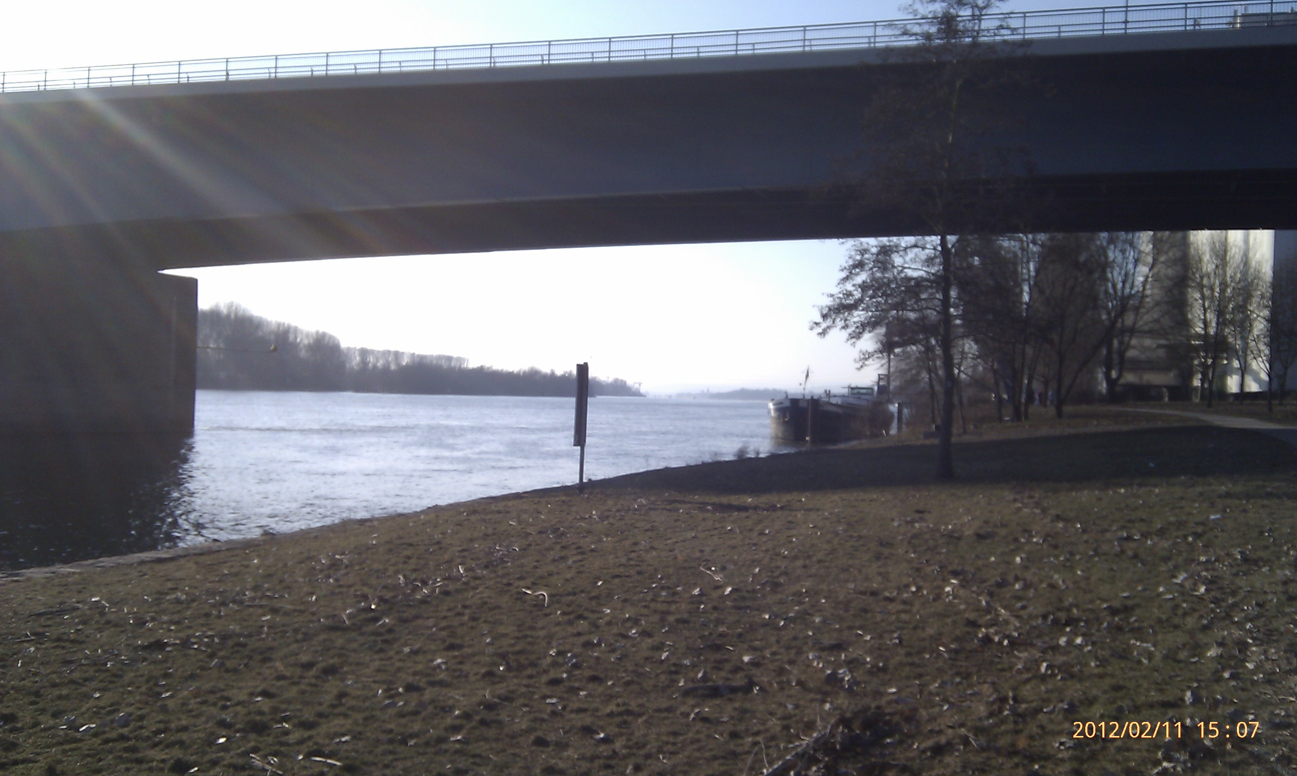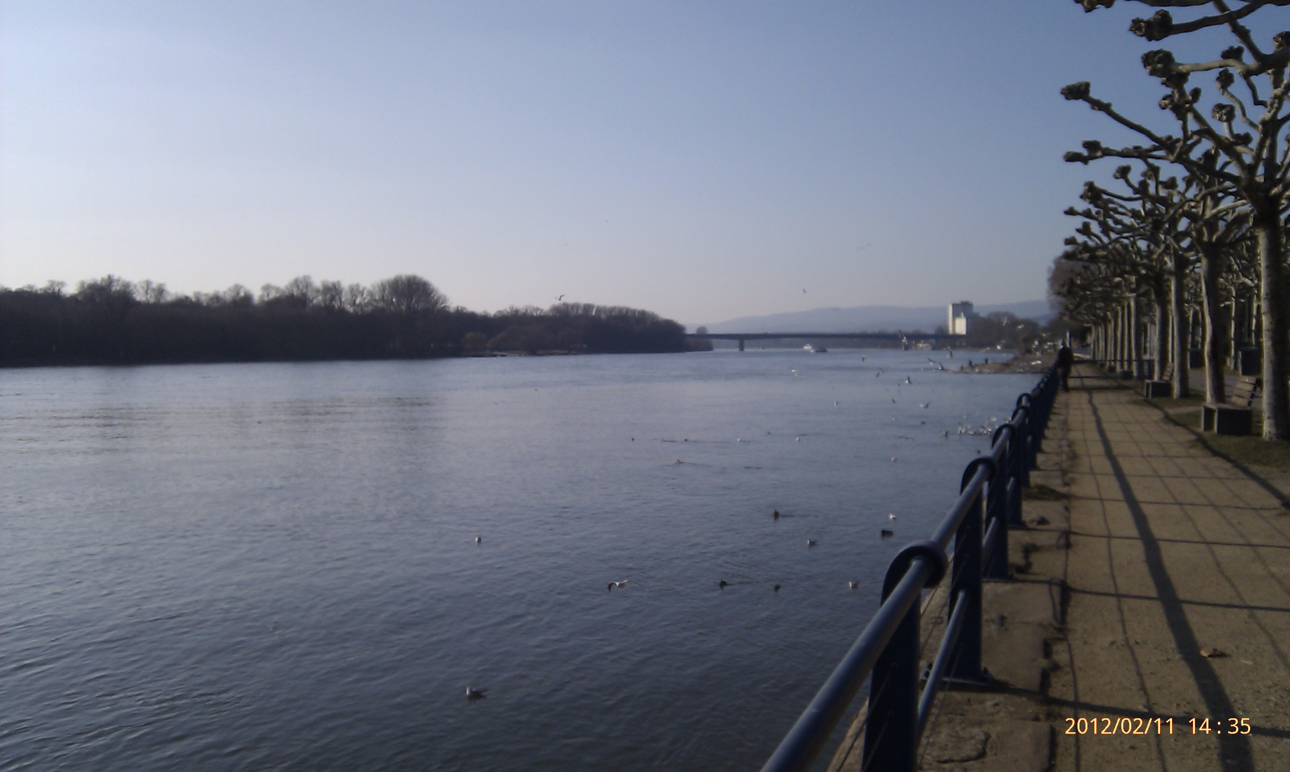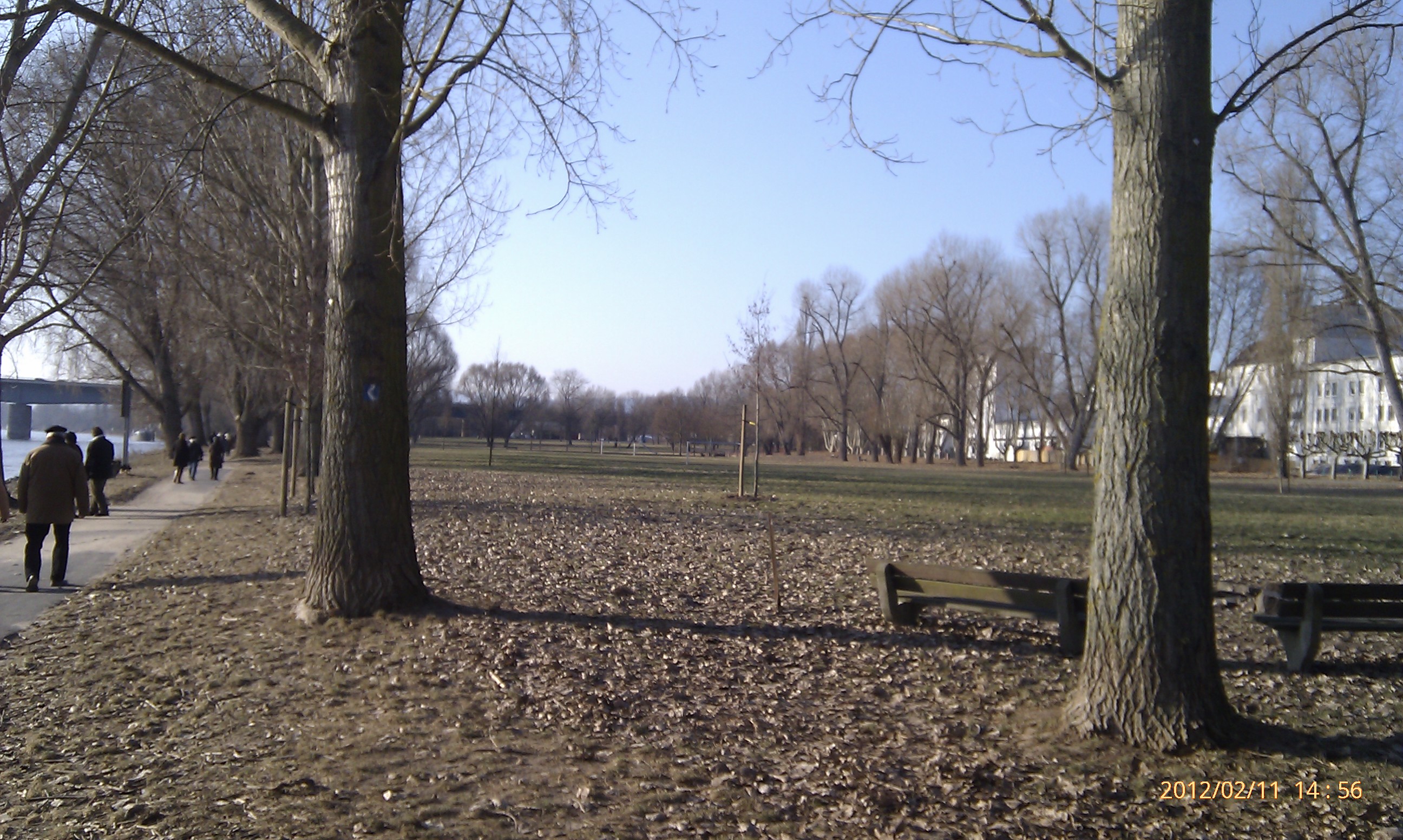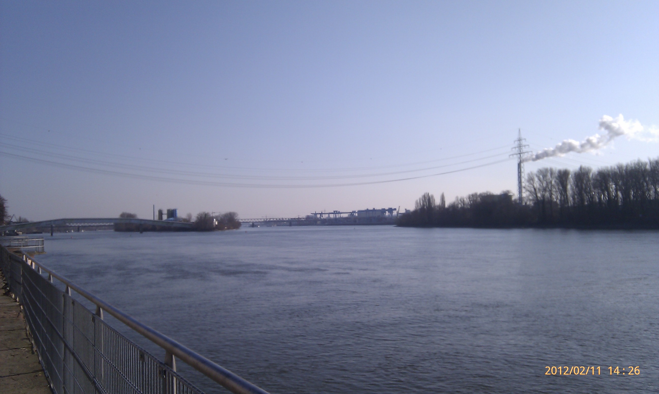 Und weiter gehts nach Süden! Wobei hier der Weg durch die Umrundung einer Art Industriehalde etwas umgelenkt wird. Als ich an dieser vorbei war, konnte ich mich wieder in Richtung Stadt, also wieder nach Nordwest wenden. Das heißt, einfach nur dem Weg folgen. Dies ist der schönste Teil der Strecke. Der Weg führt eine ganze Weile nur vorbei an Bäumen, Sträuchern und Wiesen. Außerdem werden die Bahngleise zweimal überschritten. Von der zweiten Brücke aus hat man dabei einen phantastischen Blick nach Wiesbaden-Biebrich und den alten Wasserturm. Für mich hat sich der lange Weg damit schon gelohnt.