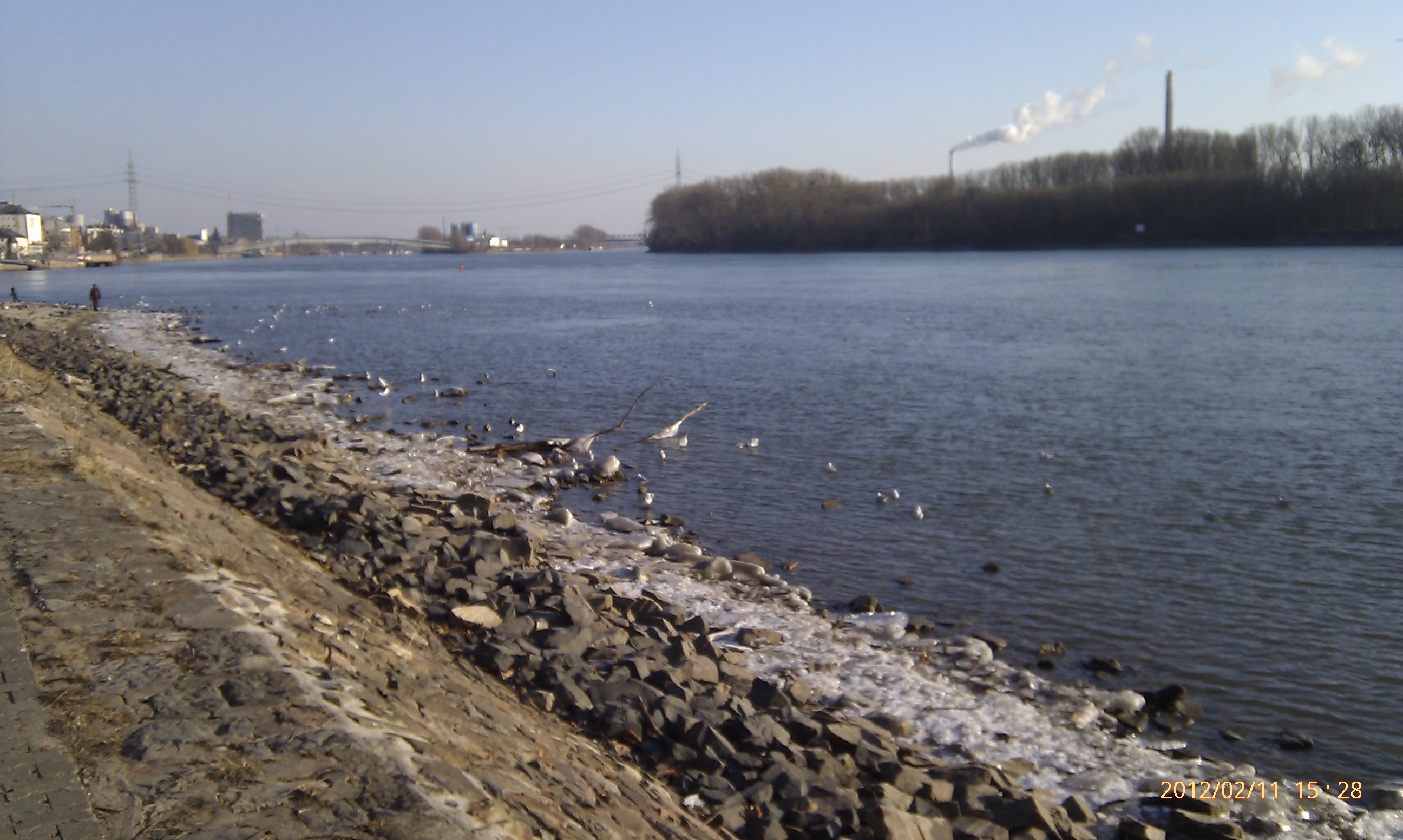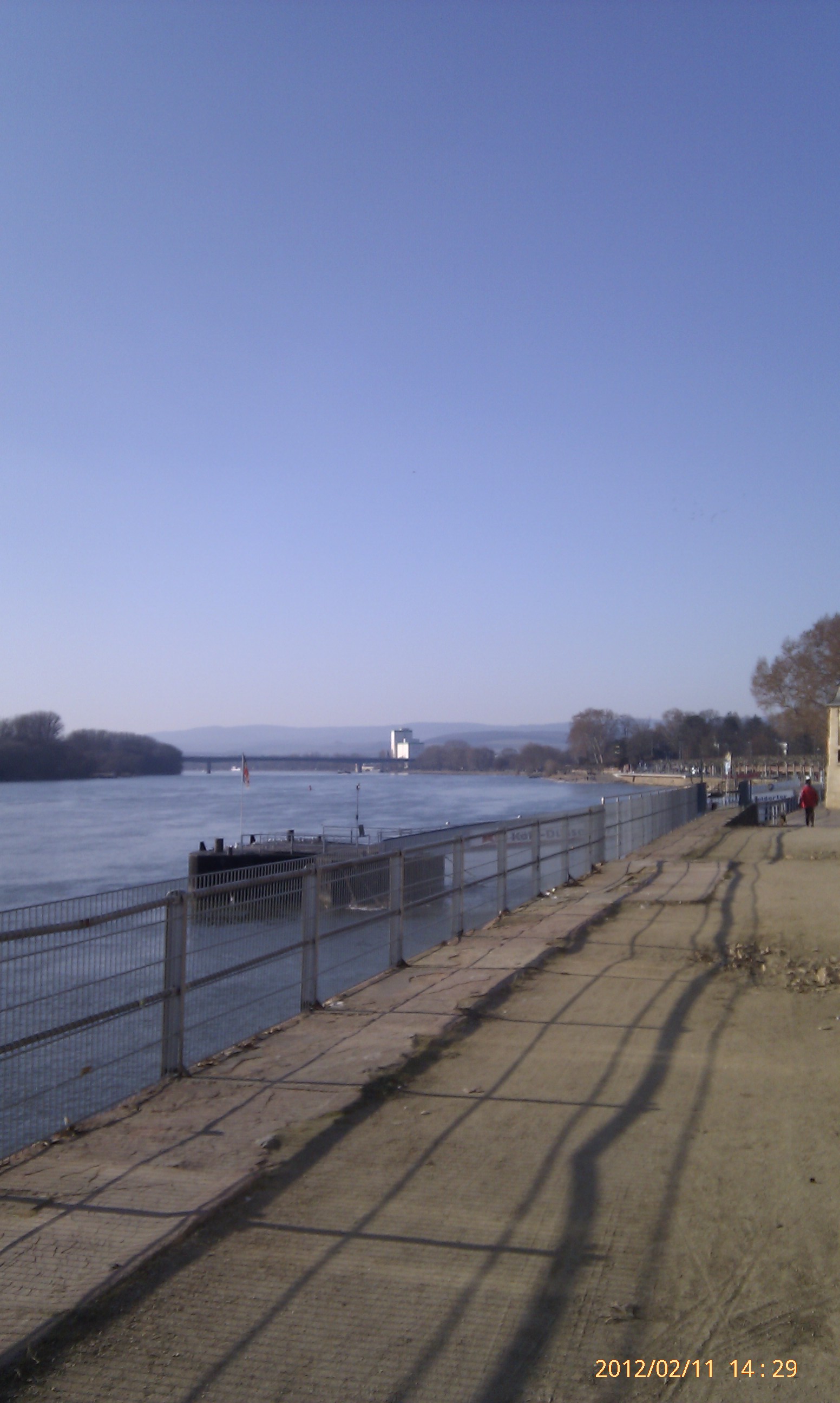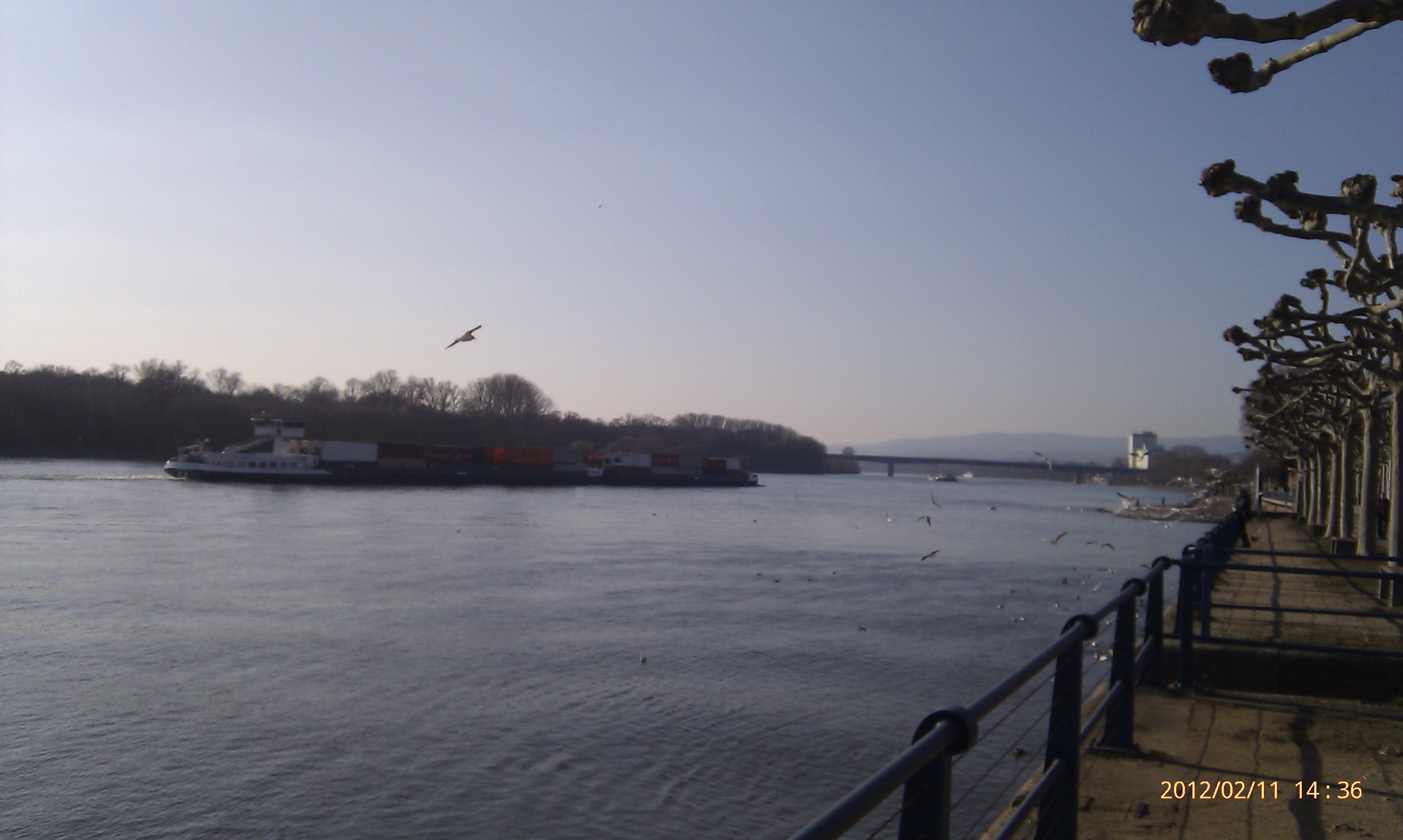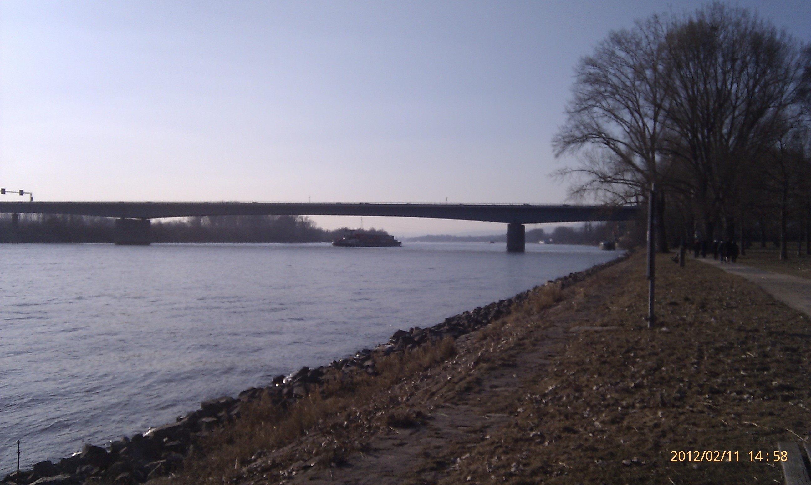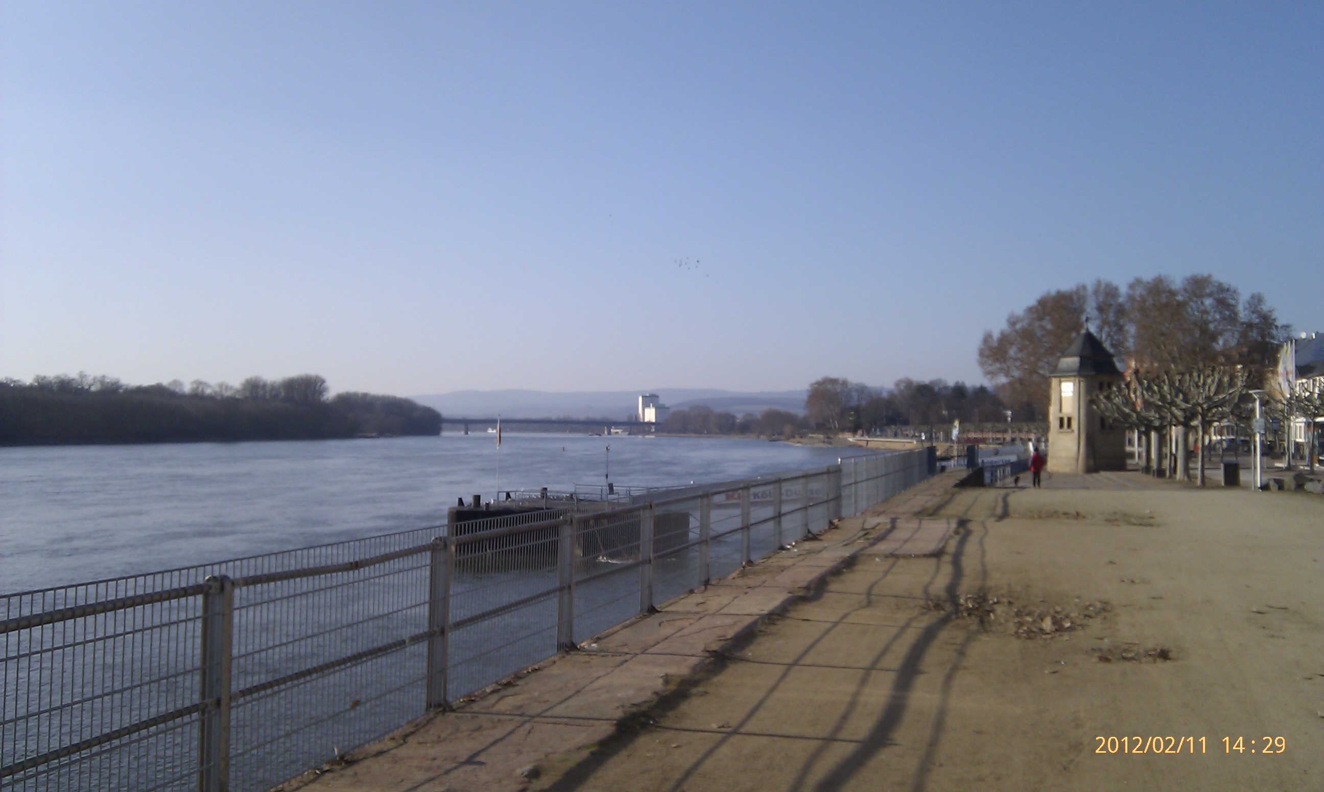 Und weiter gehts nach Süden! Wobei hier der Weg durch die Umrundung einer Art Industriehalde etwas umgelenkt wird. Als ich an dieser vorbei war, konnte ich mich wieder in Richtung Stadt, also wieder nach Nordwest wenden. Das heißt, einfach nur dem Weg folgen. Dies ist der schönste Teil der Strecke. Der Weg führt eine ganze Weile nur vorbei an Bäumen, Sträuchern und Wiesen. Außerdem werden die Bahngleise zweimal überschritten. Von der zweiten Brücke aus hat man dabei einen phantastischen Blick nach Wiesbaden-Biebrich und den alten Wasserturm. Für mich hat sich der lange Weg damit schon gelohnt.